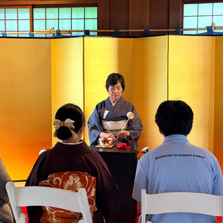 下の家ホールでは、裏千家16代家元・坐忘斎宗匠お好みの和親棚でお点前をしていただきました。お茶は小山園の「五十鈴」、お菓子は社中の生徒による手作りの和菓子をご用意し、召し上がっていただきました。